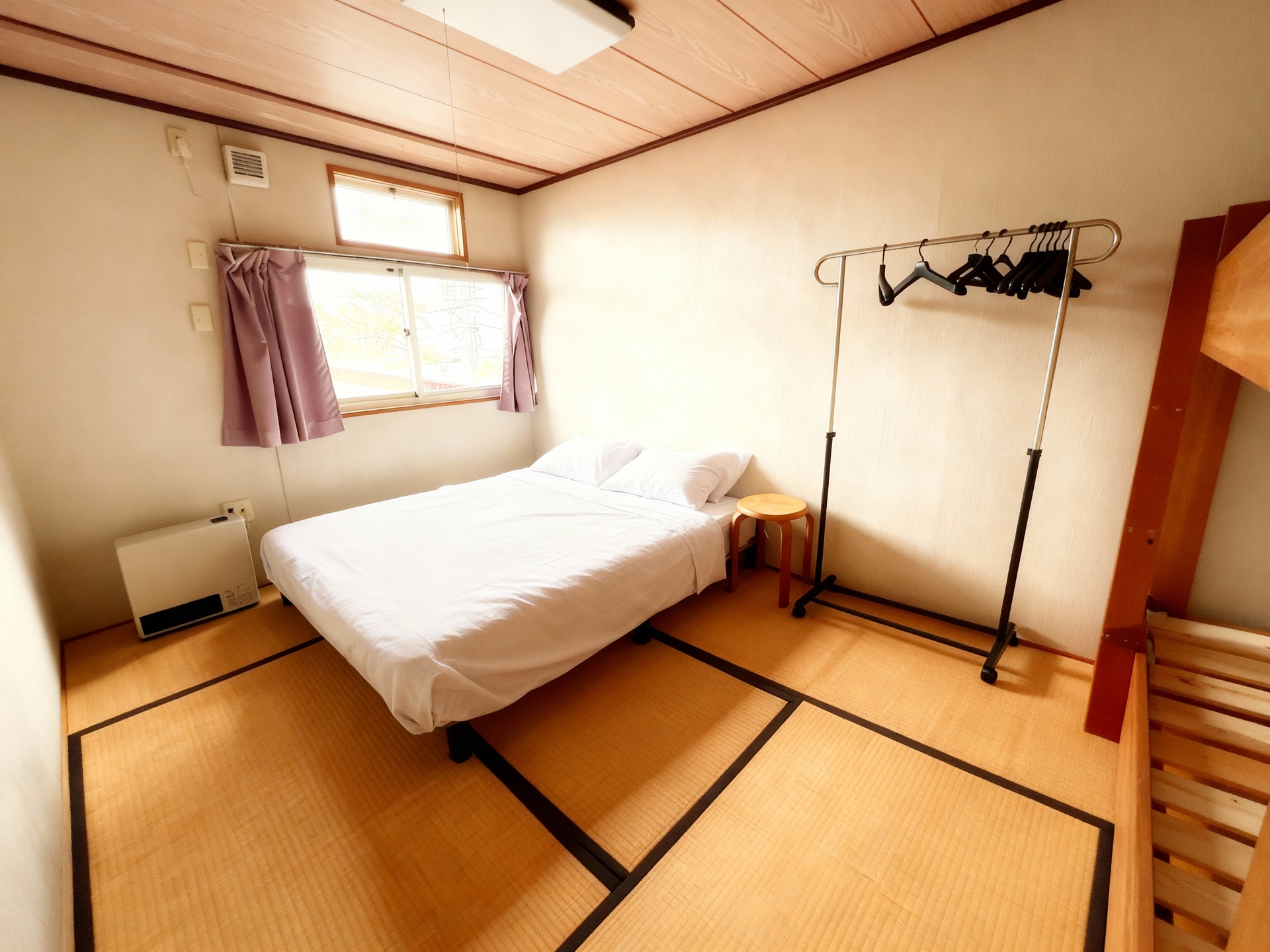 This Double Room features 1 queen western style bed with shared shower and toilet facilities. You have the choice of a Japanese style shared shower room or private communal showers. It features a clothes hanging rack, heating and linen.