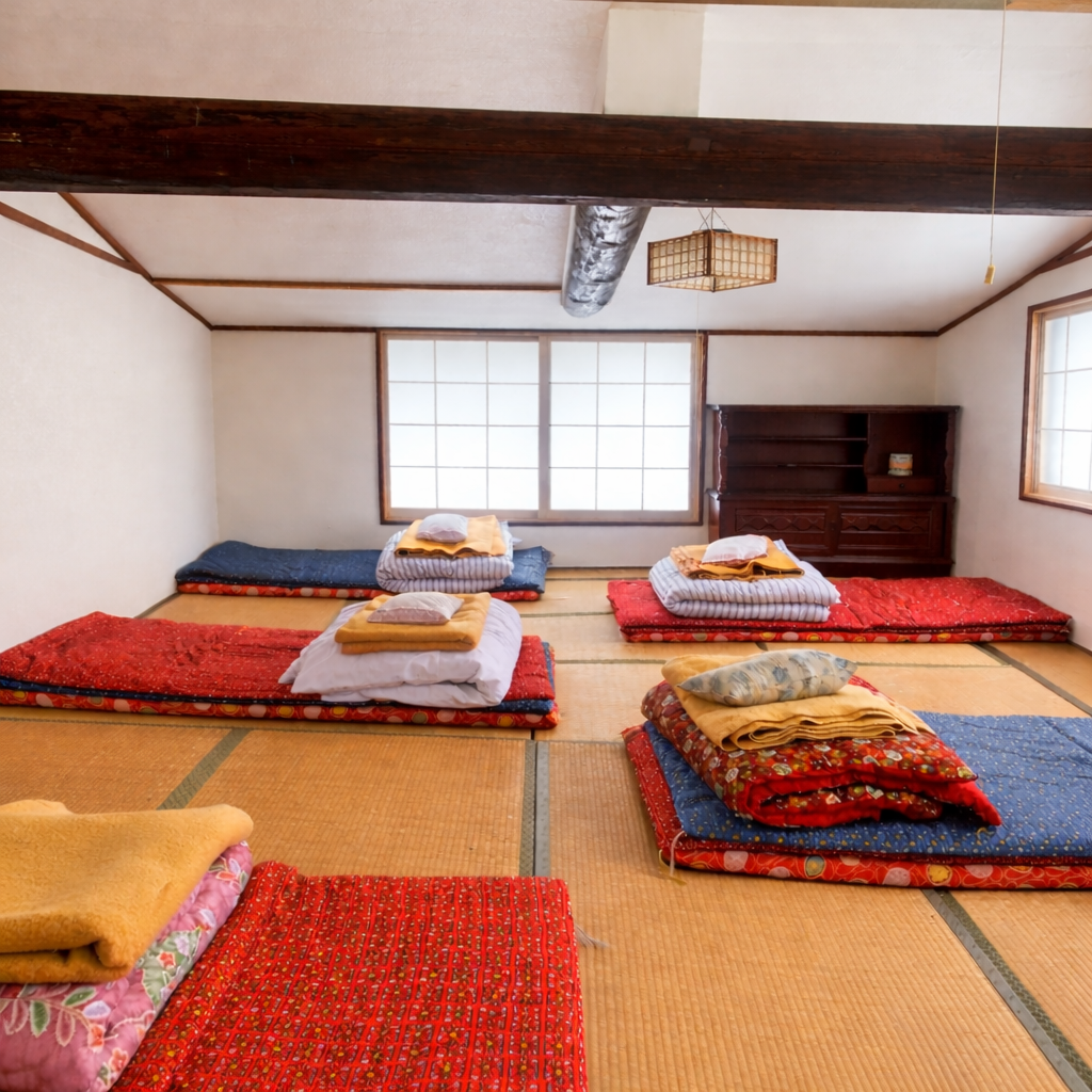 This Family Room features 1 queen western style bed and 3 single beds with shared Japanese style shower and toilet. It features clothes hanging rack/storage, heating and linen. Sleeps up to 5 people.